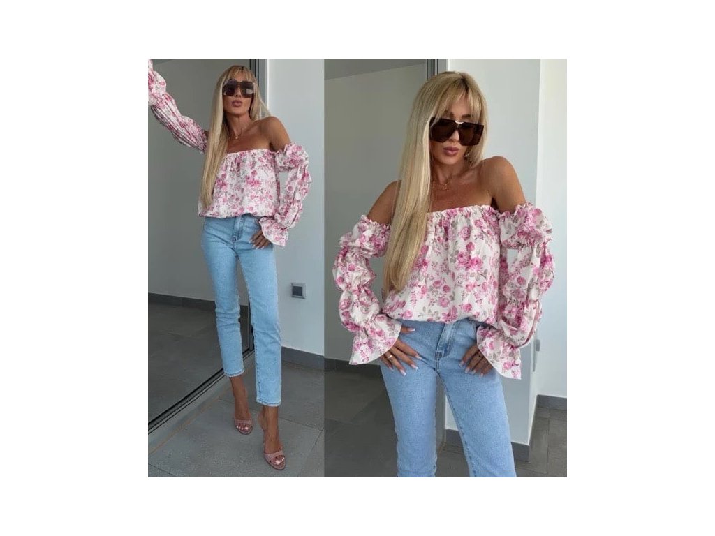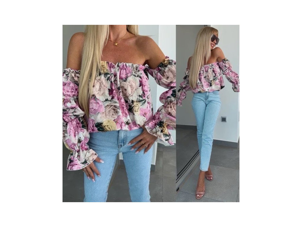 Zahaľ sa do romantiky s touto nádhernou blúzkou s odhalenými ramenami a výrazným kvetinovým vzorom. Volánové rukávy s nadýchaným efektom dodávajú celému outfitu ženskosť a jemnosť. Ideálna na letné dni, rande alebo prechádzky v meste – jednoducho všade, kde chceš zažiariť.