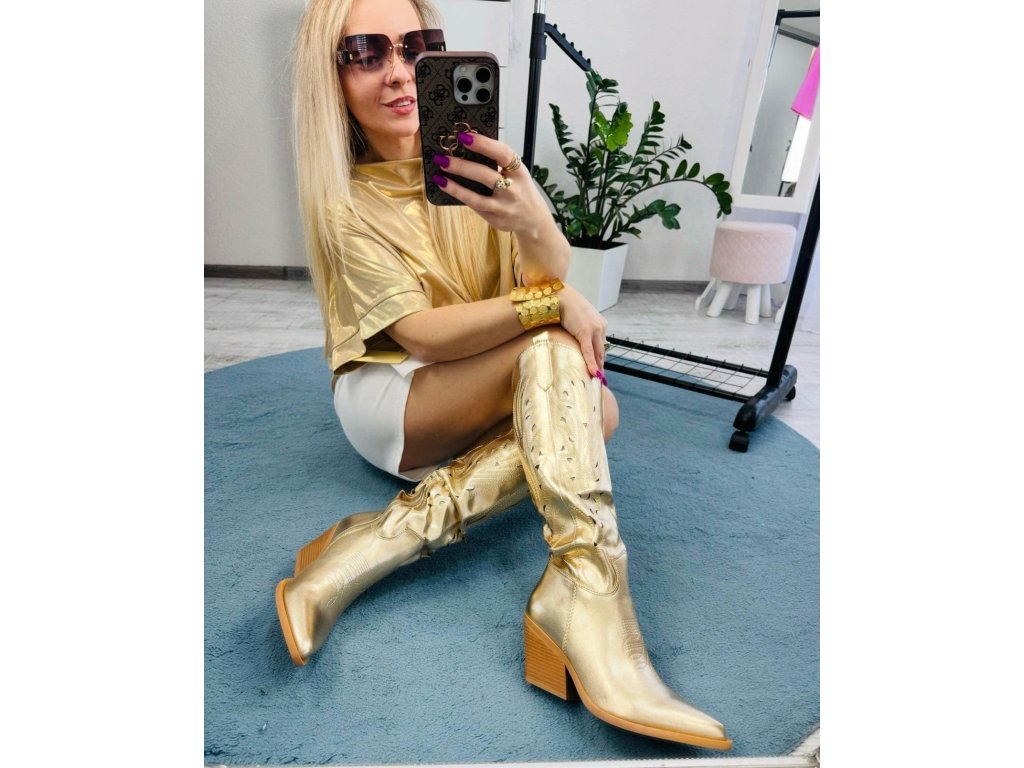 Zažiarte s týmito zlatými čižmami Golden Western! Ich metalická zlatá farba a detailné vyrezávanie na vysokom zvršku priťahujú pohľady, zatiaľ čo stabilný drevený podpätok poskytuje pohodlie pri chôdzi. Tieto čižmy sú perfektnou voľbou na festivaly, večierky alebo keď chcete svojmu outfitu dodať odvážny akcent. Vyrobené z kvalitnej syntetickej kože, ktorá zaručuje dlhú životnosť a jednoduchú údržbu.
