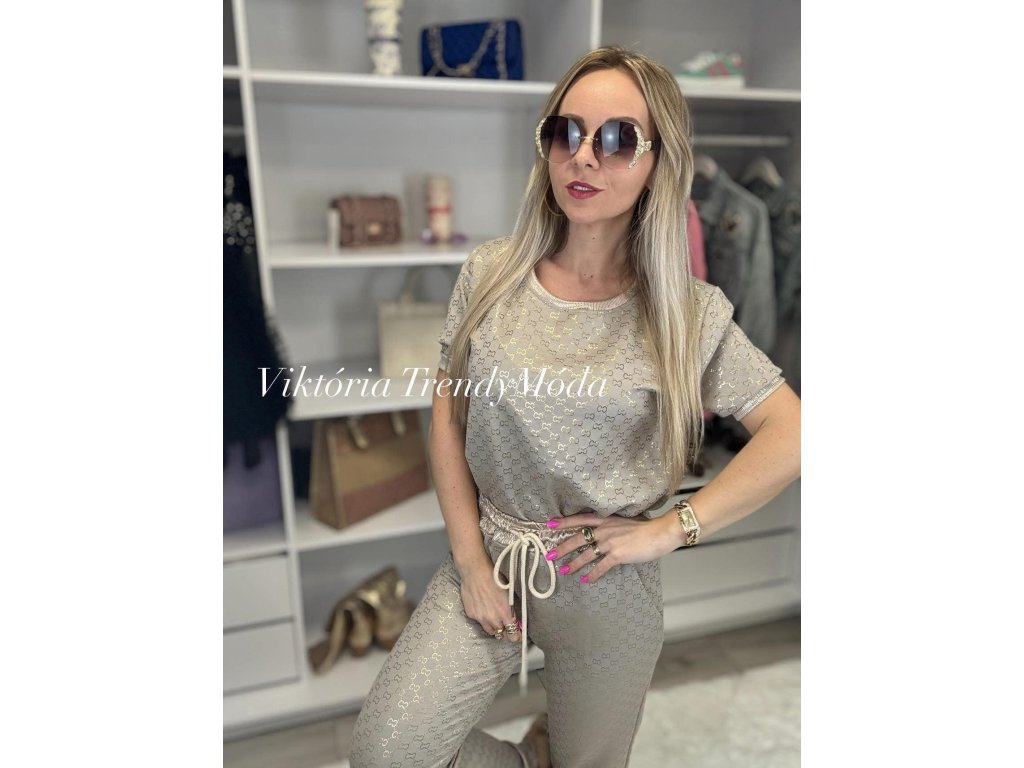 Zažiarte s našou elegantnou súpravou "Golden Bloom"! Tento set v krémovej farbe so zlatistým kvetinovým vzorom obsahuje tričko s krátkymi rukávmi a nohavice s vysokým pásom a šnúrkou. Ľahký a splývavý materiál je ideálny na domáci relax, ležérne dni alebo večerné posedenie. Vytvorte si štýlový look s touto pohodlnou a sofistikovanou súpravou!
