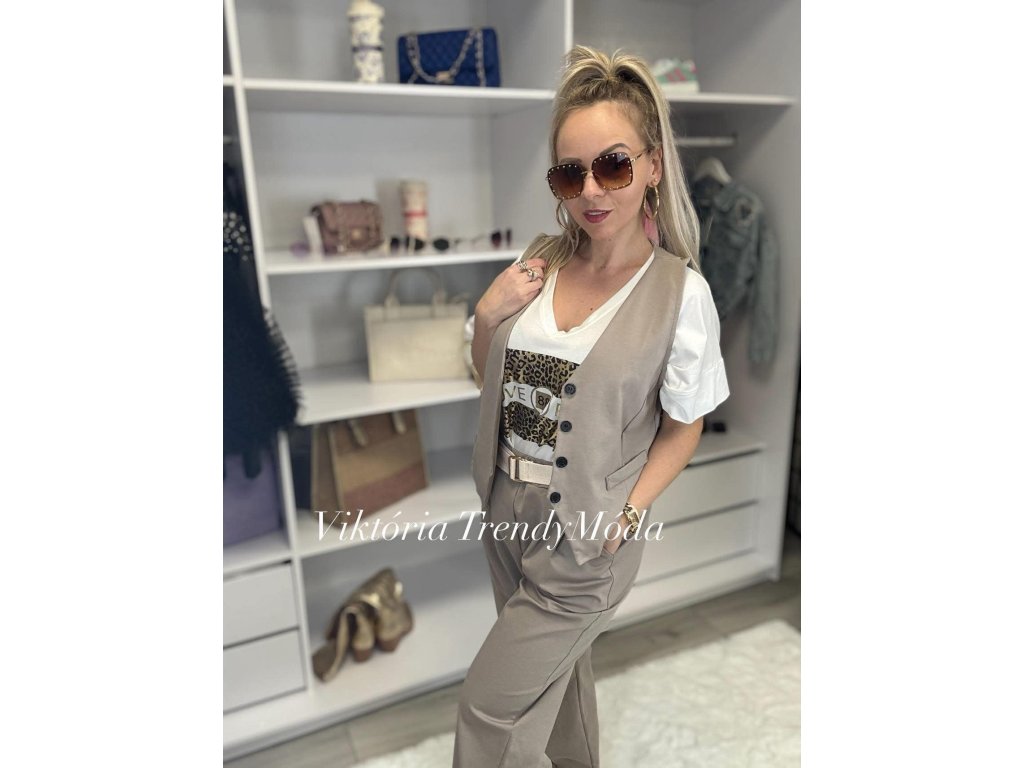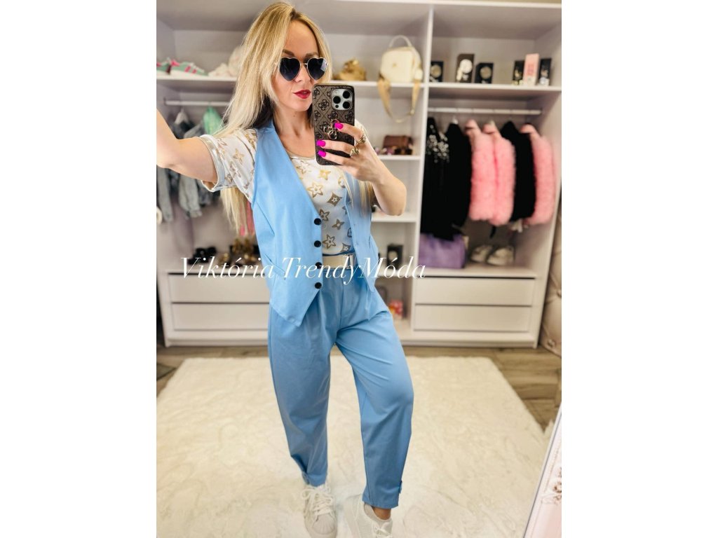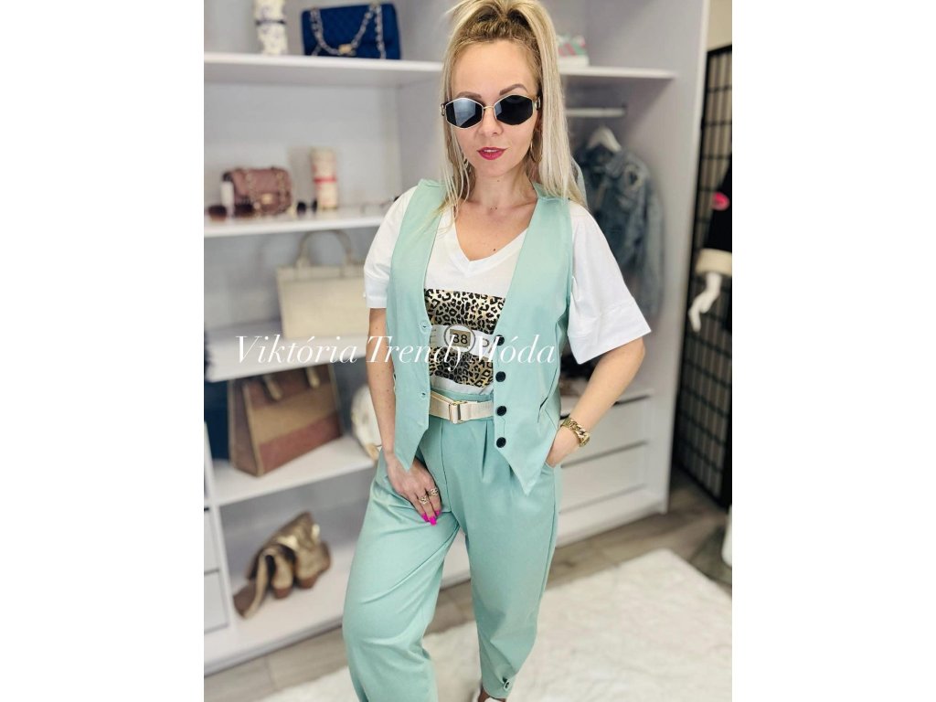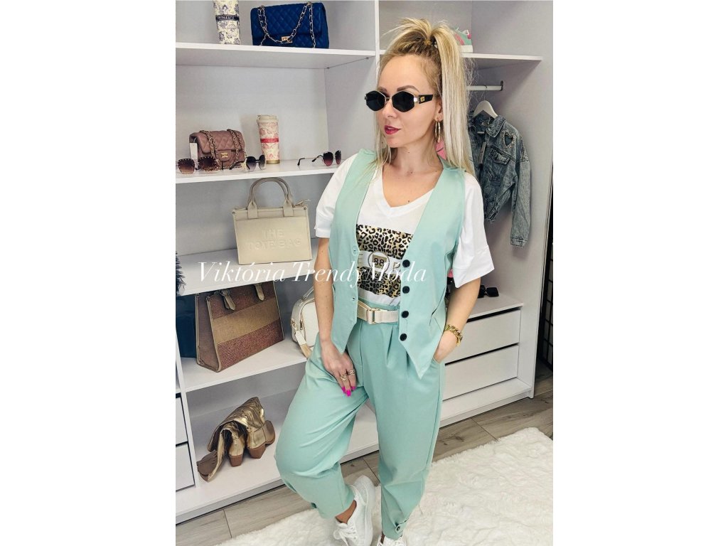Oživte svoj šatník s naším kompletom "Mint Style"! Tento svieži set v obsahuje štýlovú vestu s gombíkmi a vysoké nohavice s opaskom. Vesta má moderný strih bez rukávov a nohavice s jemnými záhybmi lichotia postave. Vyrobené z príjemnej bavlny, sú ideálne do práce alebo na stretnutie s priateľmi. Ľahko ich skombinujete s tričkom a teniskami pre dokonalý look!