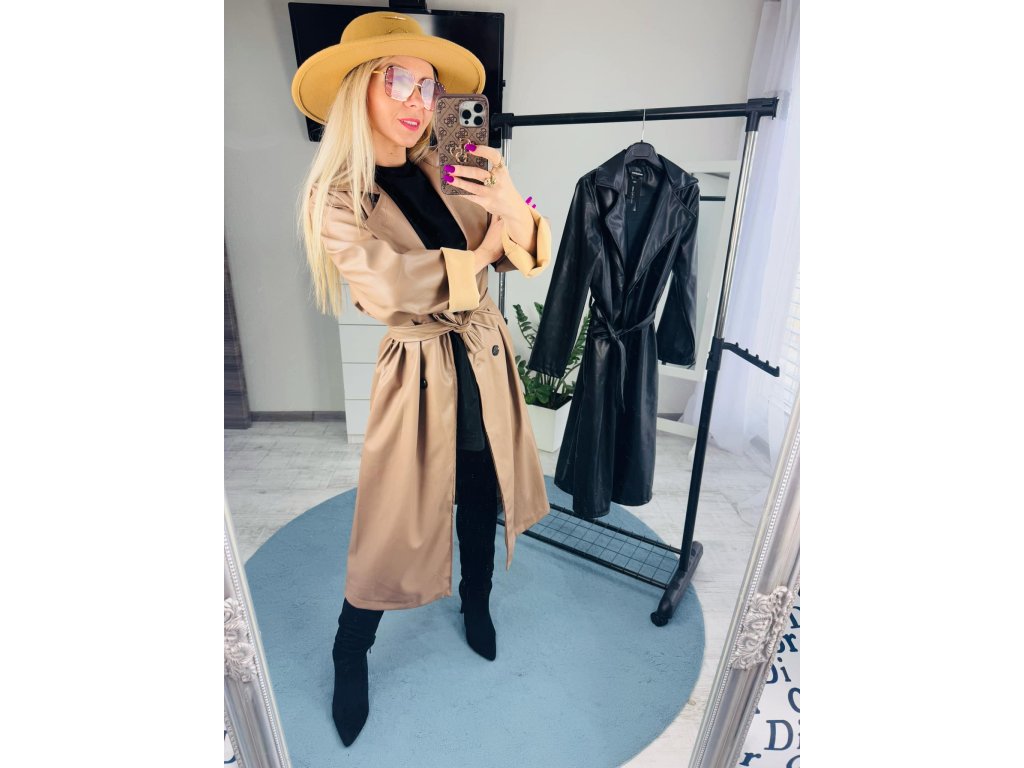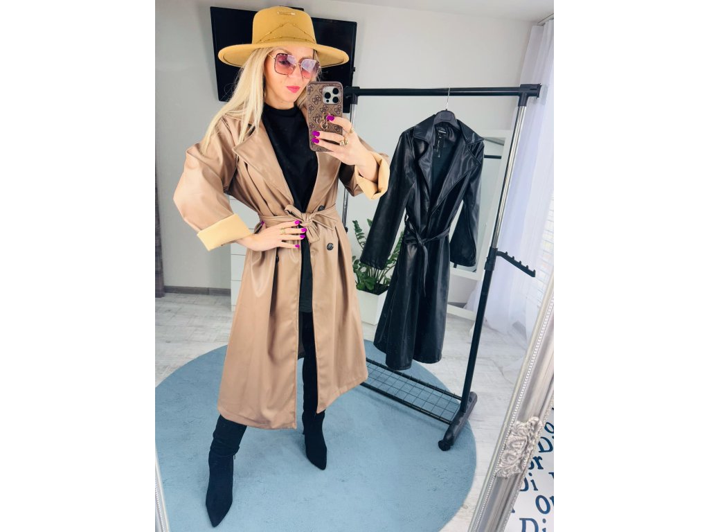 Doplnte svoj šatník o náš koženkový trenčkot "Caramel Elegance" v štýlovej béžovej farbe! Tento kabát s klasickým strihom a opaskom na zaviazanie je vyrobený z kvalitnej umelej kože, ktorá mu dodáva luxusný vzhľad a zároveň je jednoduchá na údržbu. Ideálny na jeseň aj jar – skombinujte ho s džínsami na ležérny look alebo s šatami na elegantnú príležitosť. Jeho nadčasový dizajn vás udrží v teple a zároveň štýlovú.