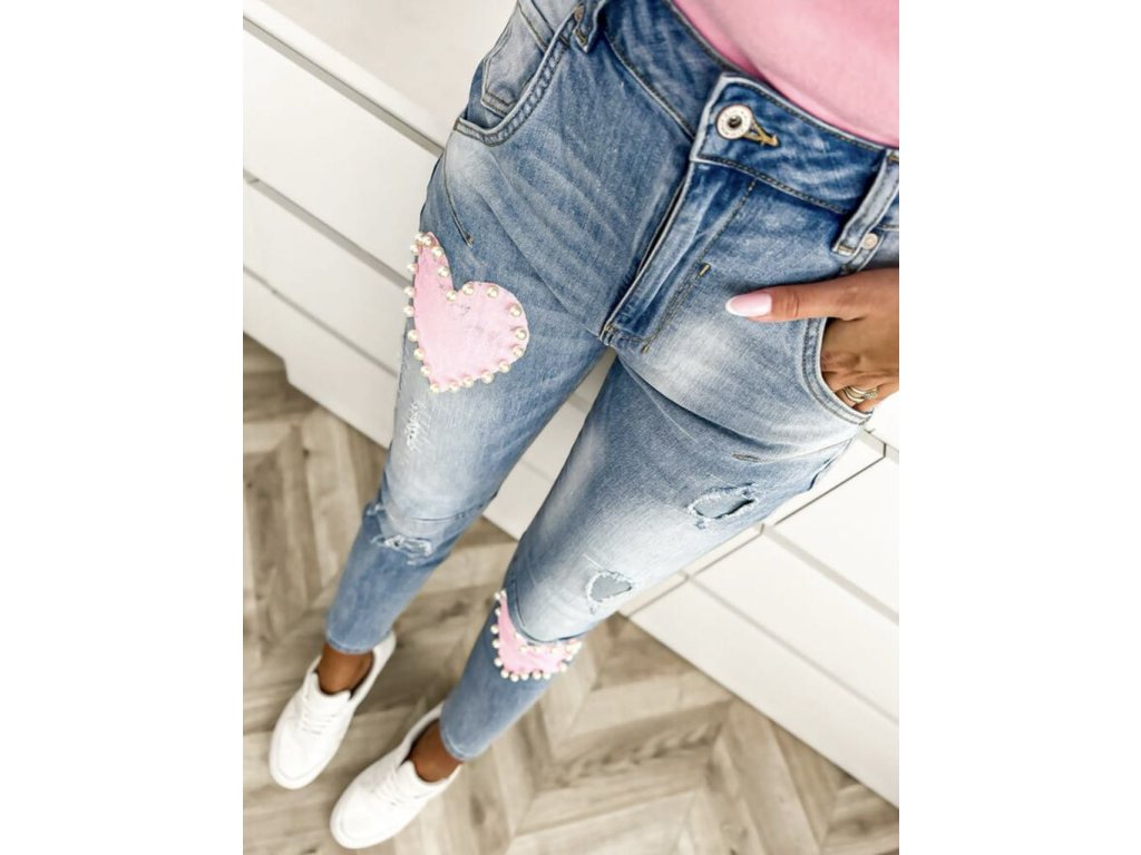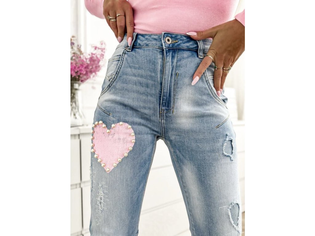 Štýlové dámske rifle v modernom dizajne s trhaným efektom a originálnymi detailmi. Na stehne a kolene zdobené ružovými srdiečkami lemovanými perličkami, ktoré dodávajú romantický a jedinečný vzhľad. Vyrobené z kvalitného elastického denimu pre maximálne pohodlie a skvelé prispôsobenie postave. Perfektné na bežné nosenie aj na špeciálne príležitosti.
