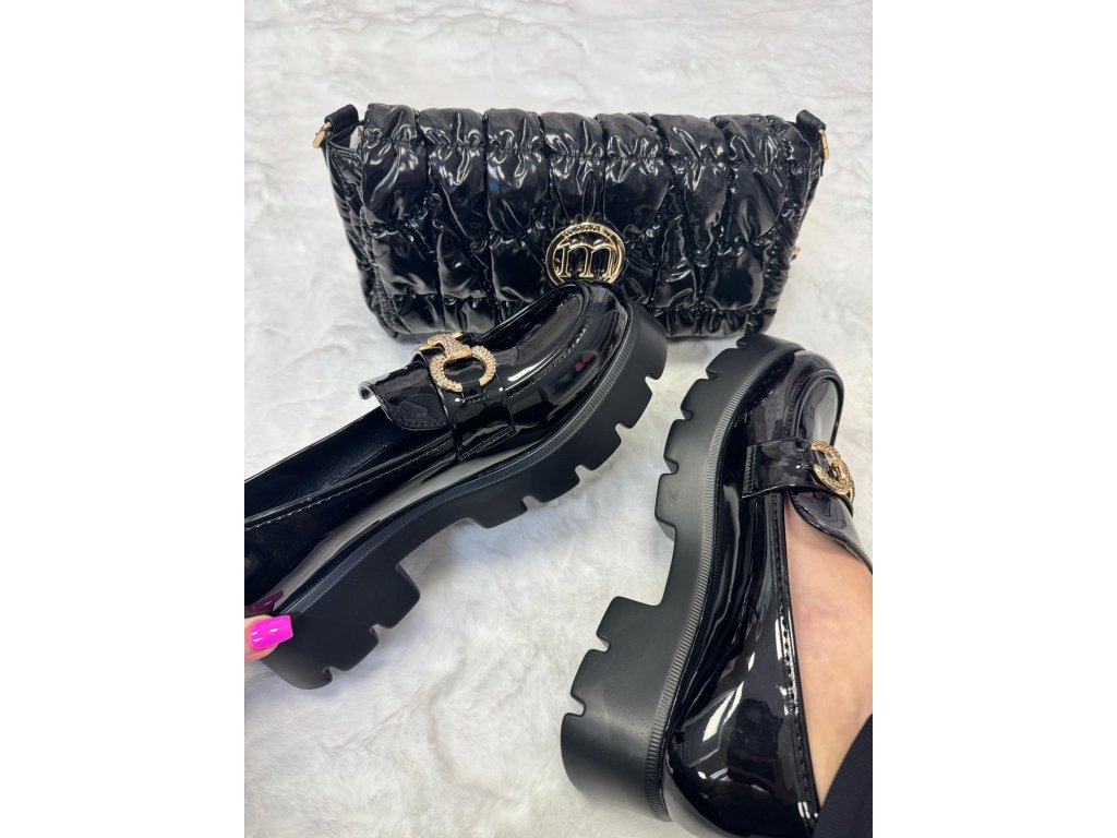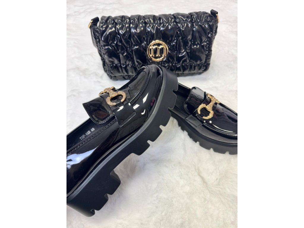 Doprajte svojim nohám štýl a pohodlie s týmito luxusnými lakovanými mokasínami! Ich lesklý čierny povrch púta pohľady a dokonale podčiarkne váš outfit – či už ide o každodenný look, alebo špeciálnu príležitosť. Mokasíny sú zdobené elegantnou zlatou ozdobou s jemnými kamienkami, ktoré dodávajú šmrnc a sofistikovanosť. Robustná podrážka s moderným dizajnom zabezpečuje stabilitu a pohodlie pri každom kroku.