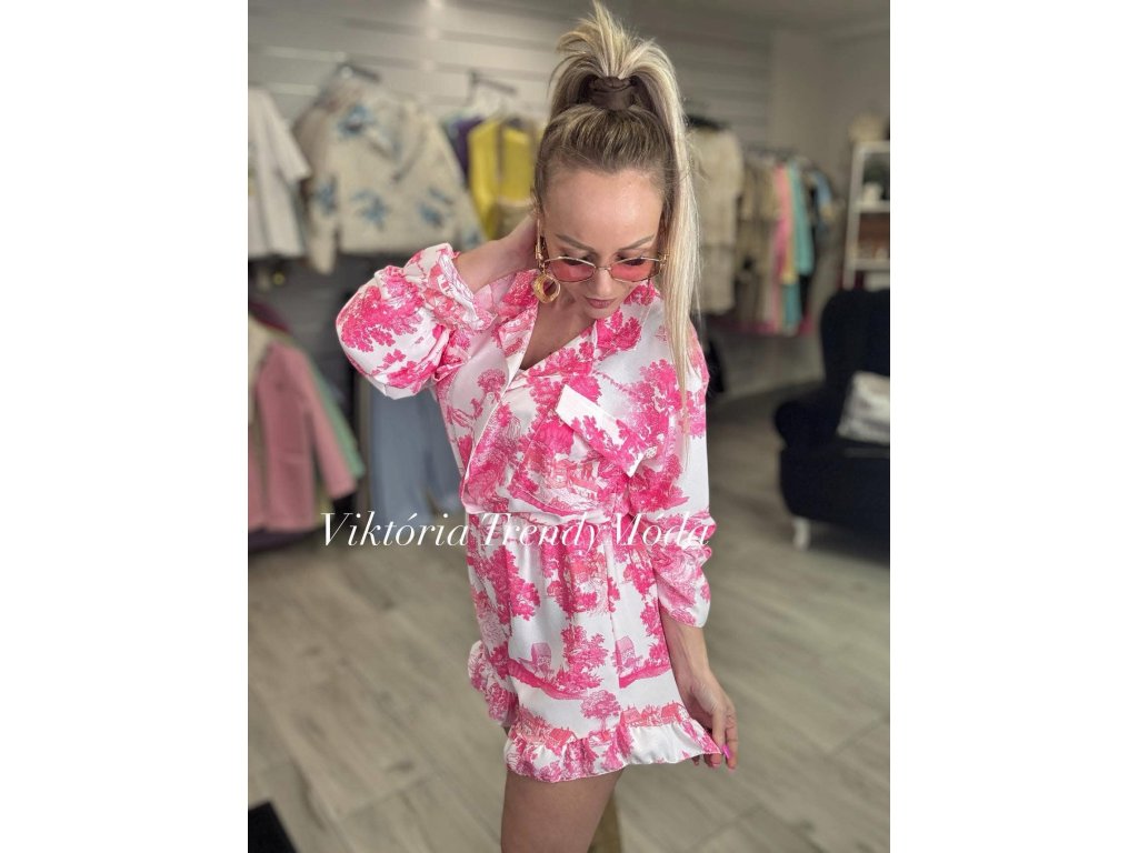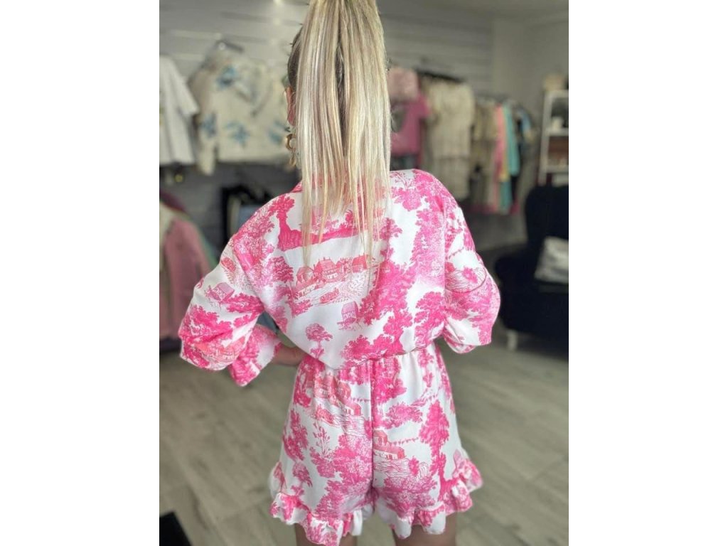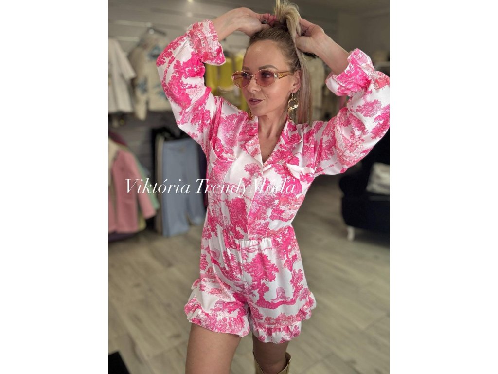 Zažiarte v našom dámskom overale Pink Toile, ktorý spája eleganciu a pohodlie v jednom! Tento overal v bielo-ružovej kombinácii s romantickým vzorom inšpirovaným klasickým toile de Jouy dizajnom je ideálnou voľbou pre ženy, ktoré milujú jedinečný štýl. Má košeľový strih s dlhými rukávmi, gombíkovou légou a volánovým lemom na šortkách, ktorý dodáva outfitu jemný a ženský nádych. Overal je vyrobený z ľahkého a priedušného materiálu, ktorý vám zabezpečí komfort počas celého dňa.