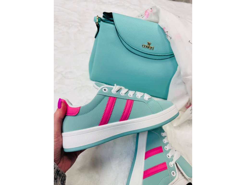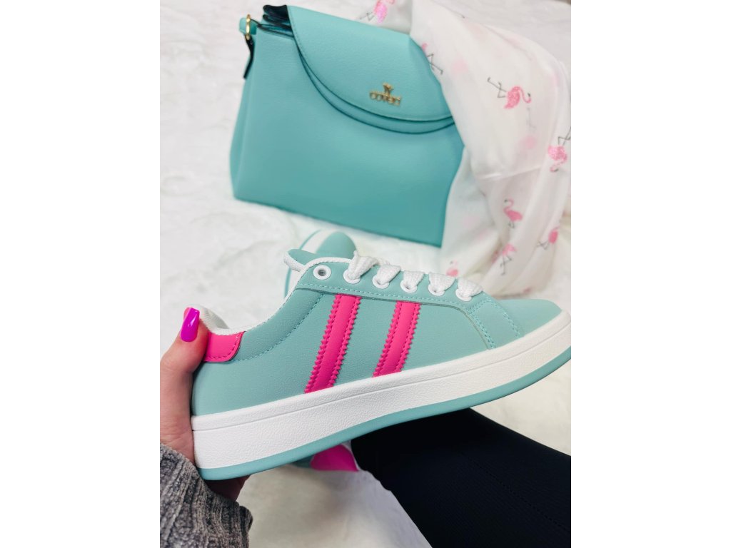 Daj svojmu kroku štýlový šmrnc! Jedinečná kombinácia jemnej tyrkysovej farby s výraznými ružovými detailmi zaručene pritiahne pozornosť. Tieto tenisky sú ľahké, pohodlné a ideálne na každodenné nosenie. Vďaka mäkkej stielke a flexibilnej podrážke si užiješ maximálny komfort po celý deň.