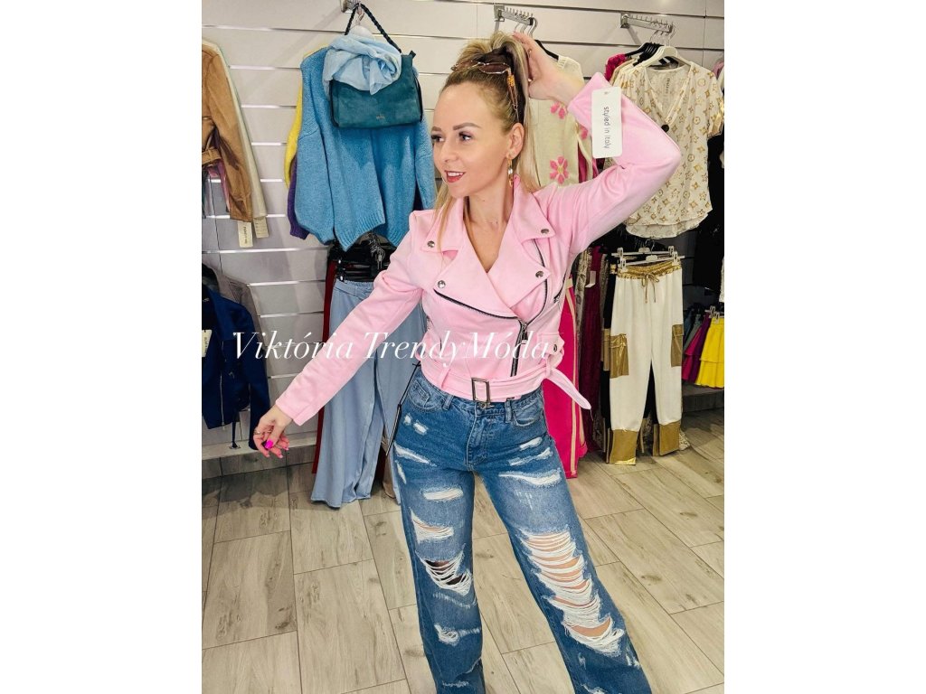 Je štýlová bunda pre ženy, ktoré chcú vyniknúť. V nežnej ružovej farbe s rebelským dizajnom brúsenej kože a nastaviteľným opaskom, ktorý zvýrazní pás. Má zapínanie na zips a kovové detaily. Skvele sa hodí k džínsam, sukniam či šatám – ideálna na každodenné nosenie aj večerné výlety.