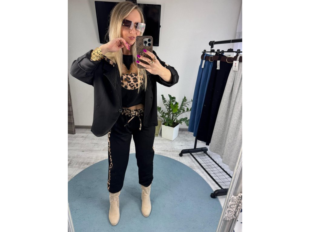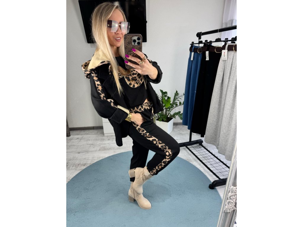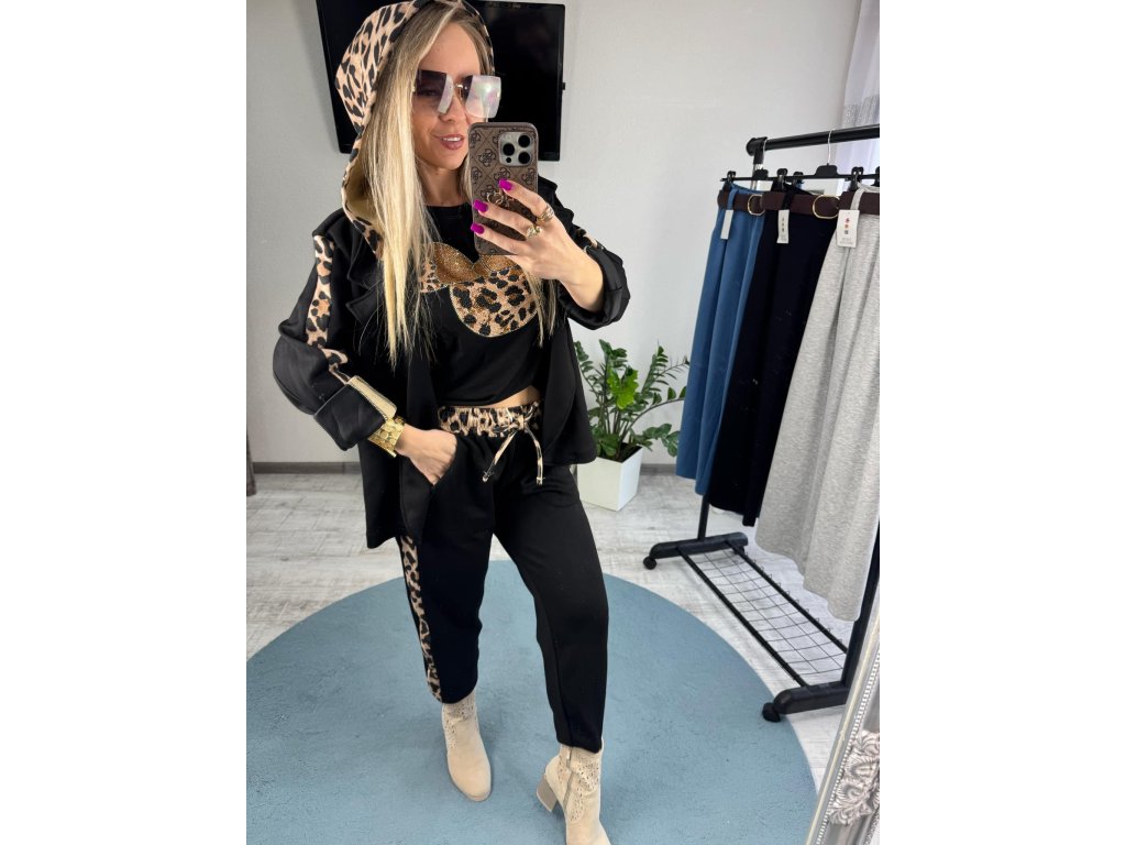 Doprajte si dávku elegancie a divokého šarmu s našou dámskou súpravou Wild Elegance! Táto štýlová kombinácia saka a nohavíc v čiernej farbe s leopardími detailmi je ideálna pre ženy, ktoré chcú vyniknúť. Sako s kapucňou a leopardím lemovaním dodáva outfitu moderný a odvážny vzhľad, zatiaľ čo pohodlné nohavice s elastickým pásom a leopardími pruhmi na bokoch zabezpečia celodenné pohodlie. Súprava pozostáva zo saka a nohavic.
