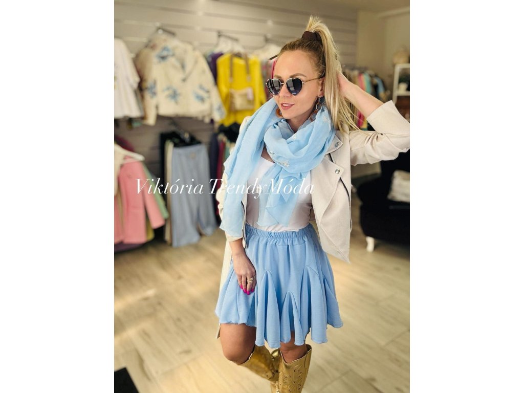 Táto krásna svetlomodrá sukňa v áčkovom strihu prináša kombináciu pohodlia a elegancie. Má elastický pás, ktorý sa prispôsobí postave, a jemne nariasené volány, ktoré dodávajú sukni romantický a vzdušný vzhľad. Skvele sa hodí na bežné nosenie aj špeciálne príležitosti. Výborne ju doplníte blúzkou, sakom alebo čižmami pre štýlový outfit.